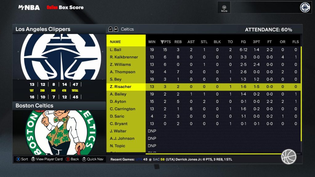 | L. Ball | 19 | 15 | 3 | 2 | 6/12 | 1/4 | 2/2 | 1 | 0 | 2 | 15.6 |