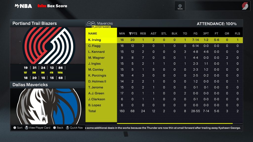 Portland Trail Blazers | Giocatore | MIN | PTS | REB | AST | FG | 3PT | FT | STL | BLK | TO | MVP |