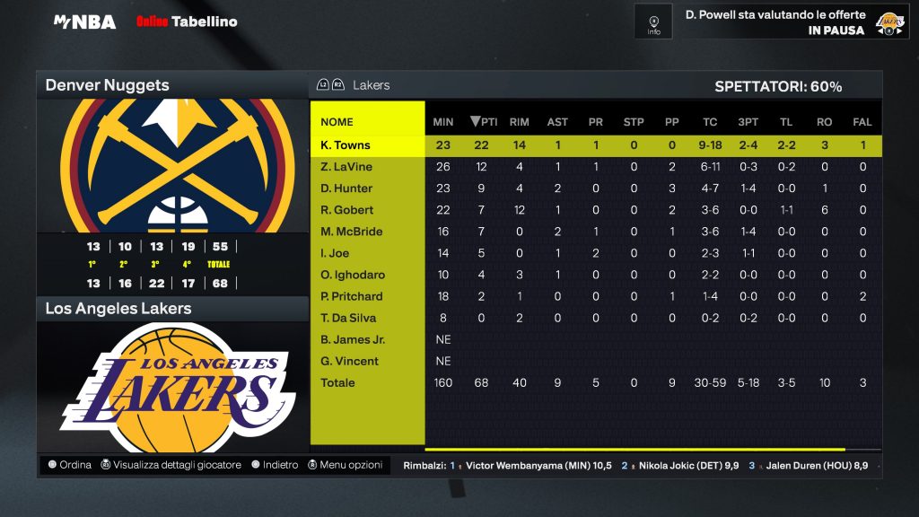 Los Angeles Lakers | Giocatore | MIN | PTS | REB | AST | FG | 3PT | FT | STL | BLK | TO | MVP |