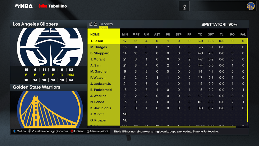 Los Angeles Clippers | Giocatore | MIN | PTS | REB | AST | FG | 3PT | FT | STL | BLK | TO | MVP |