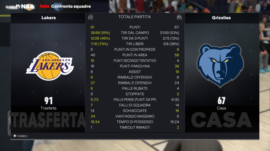 Los Angeles Lakers | Giocatore | MIN | PTS | REB | AST | FG | 3PT | FT | STL | BLK | TO | MVP |