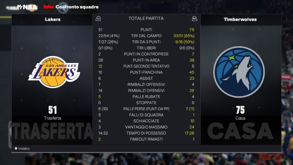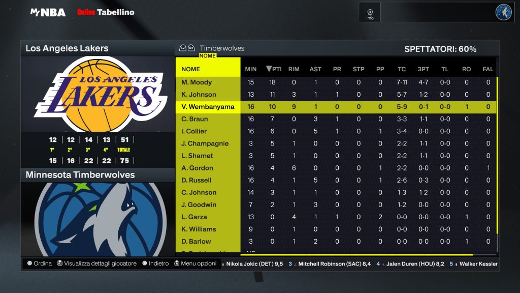 Los Angeles Lakers | Giocatore | MIN | PTS | REB | AST | FG | 3PT | FT | STL | BLK | TO | MVP |