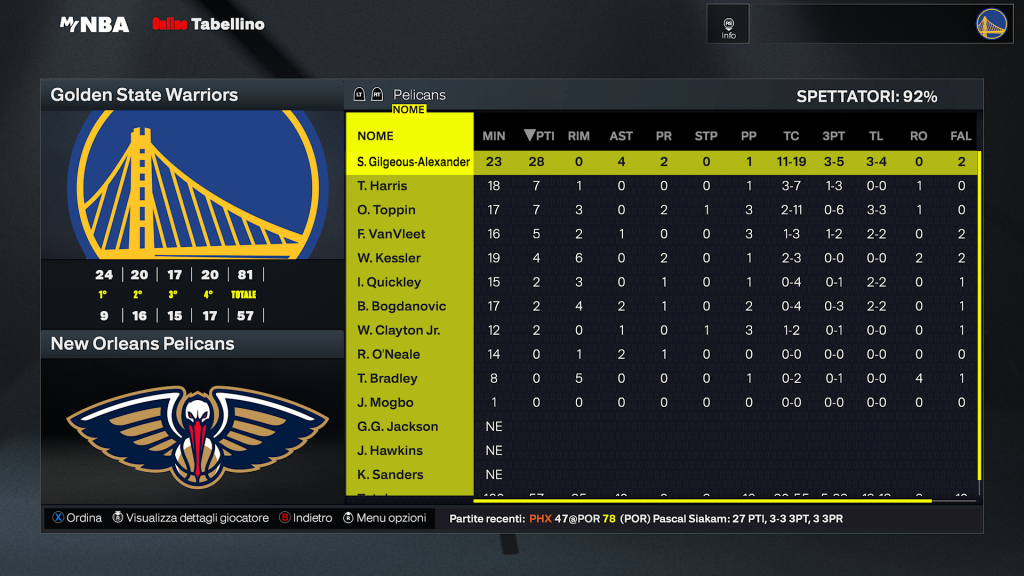 New Orleans Pelicans | Giocatore | MIN | PTS | REB | AST | FG | 3PT | FT | STL | BLK | TO | MVP |