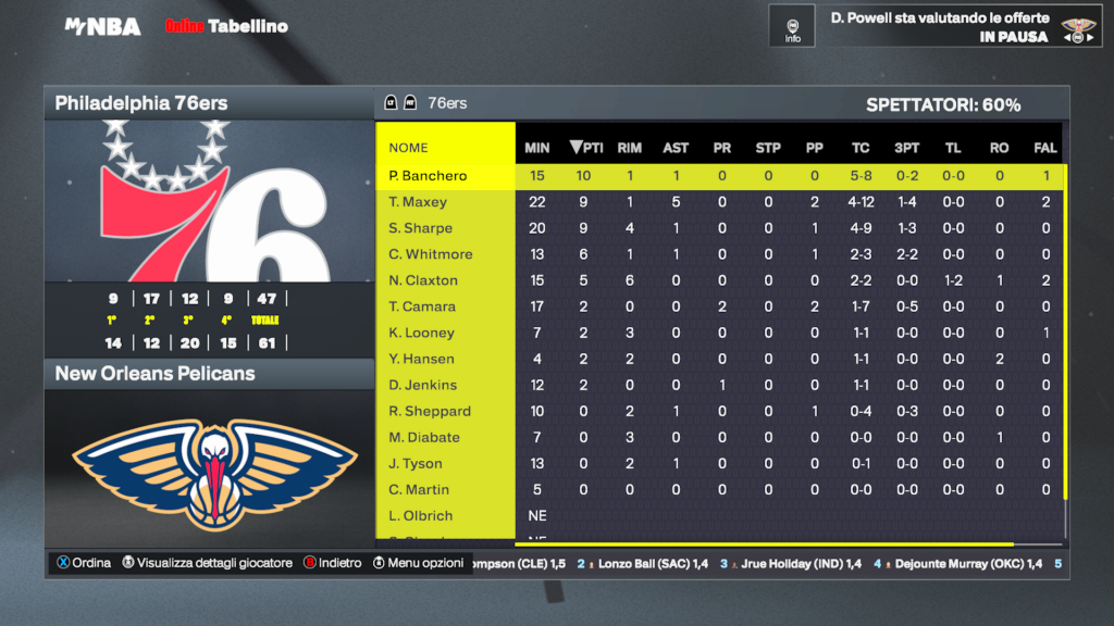 Philadelphia 76ers | Giocatore | MIN | PTS | REB | AST | FG | 3PT | FT | STL | BLK | TO | MVP |