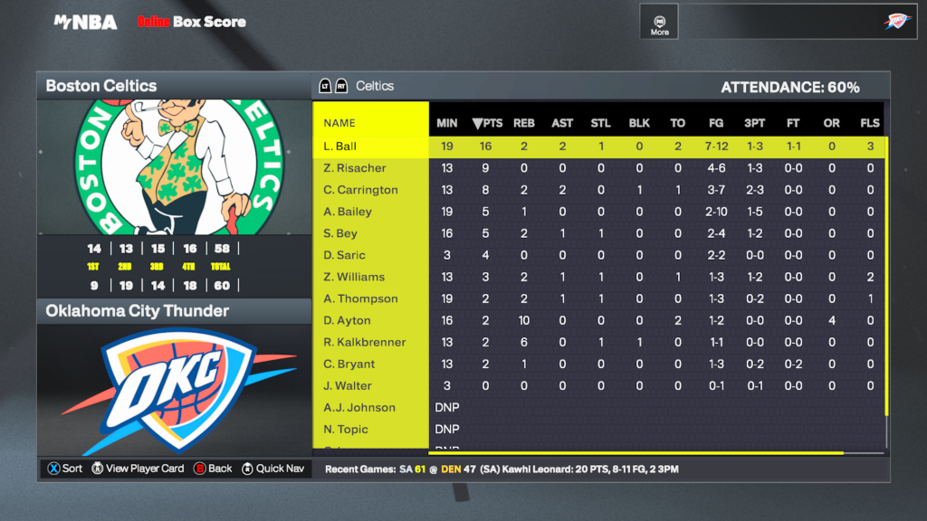 | Z. Risacher | 13 | 9 | 0 | 0 | 4/6 | 1/3 | 0/0 | 0 | 0 | 0 | 7.9 |