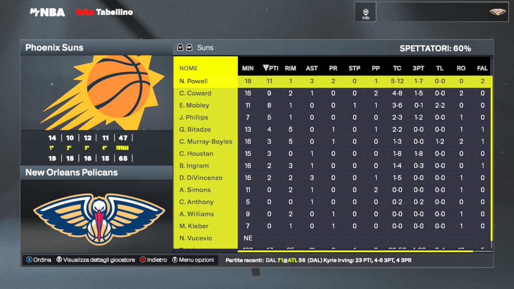 New Orleans Pelicans | Giocatore | MIN | PTS | REB | AST | FG | 3PT | FT | STL | BLK | TO | MVP |