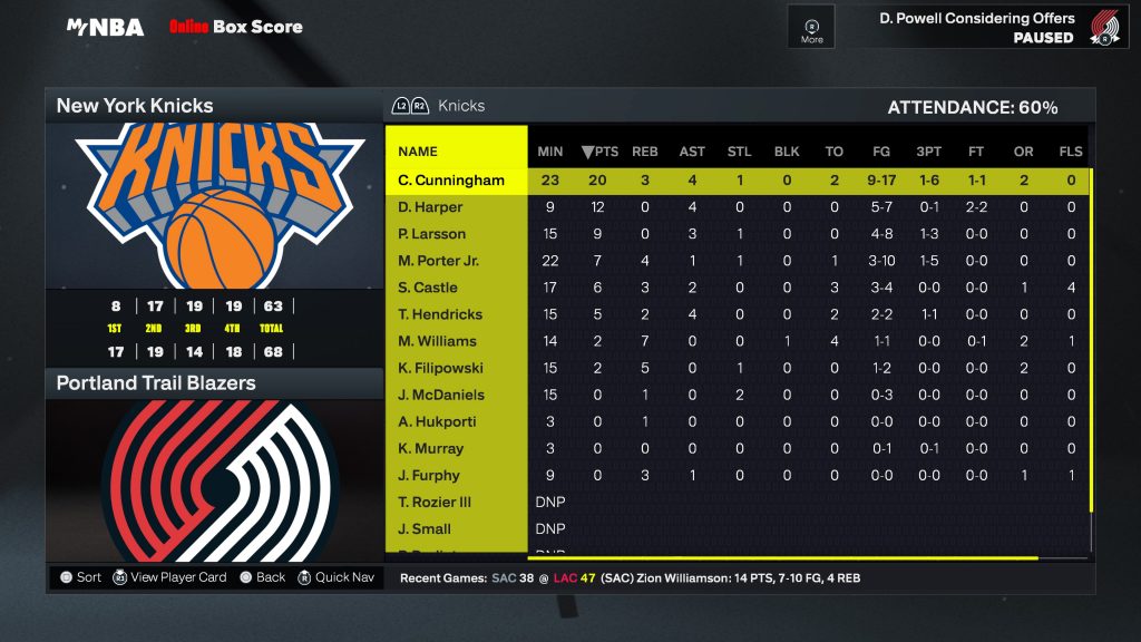 C. Cunningham 23 20 3 4 9/17 1/6 1/1 1 0 2 22.8