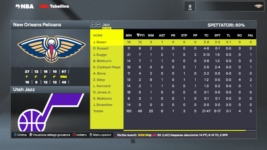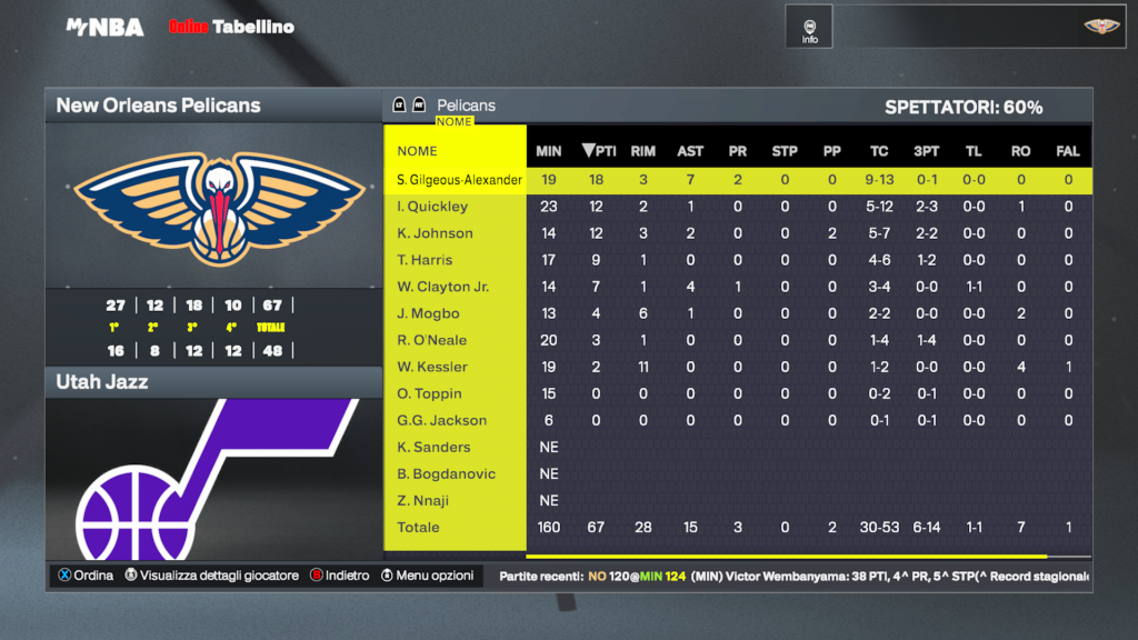 Utah Jazz | Giocatore | MIN | PTS | REB | AST | FG | 3PT | FT | STL | BLK | TO | MVP |