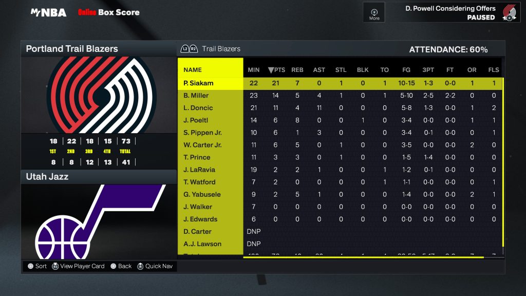 Portland Trail Blazers | Giocatore | MIN | PTS | REB | AST | FG | 3PT | FT | STL | BLK | TO | MVP |