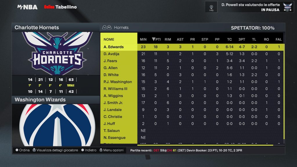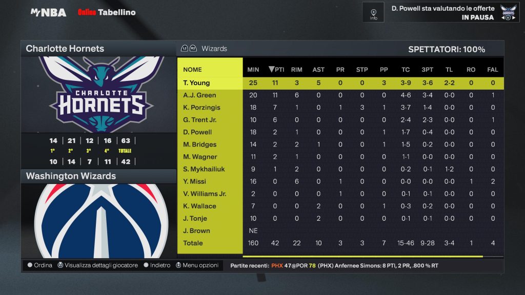 Charlotte Hornets | Giocatore | MIN | PTS | REB | AST | FG | 3PT | FT | STL | BLK | TO | MVP |