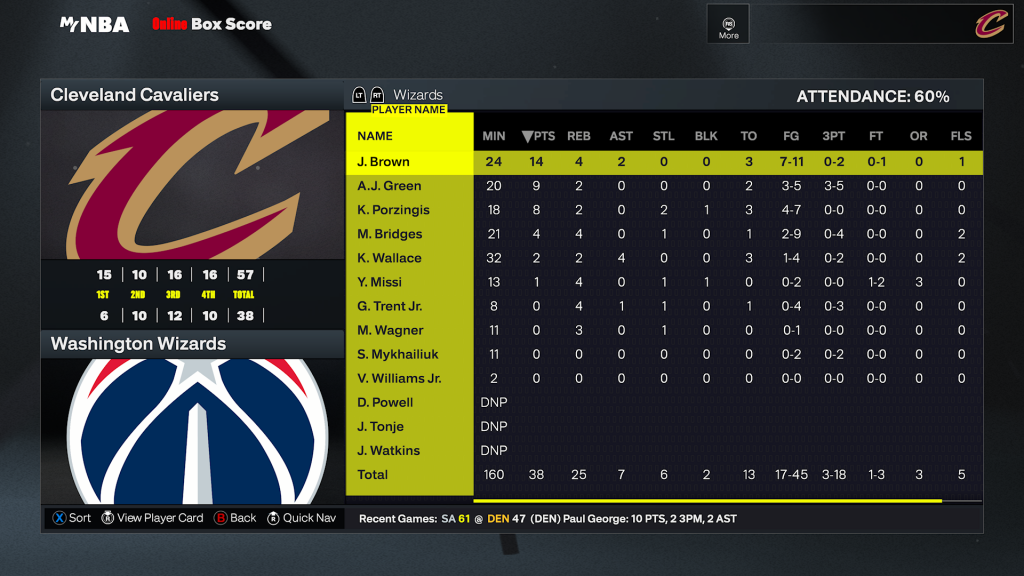 | J. Brown | 24 | 14 | 4 | 2 | 7/11 | 0/2 | 0/1 | 0 | 0 | 3 | 11.1 |