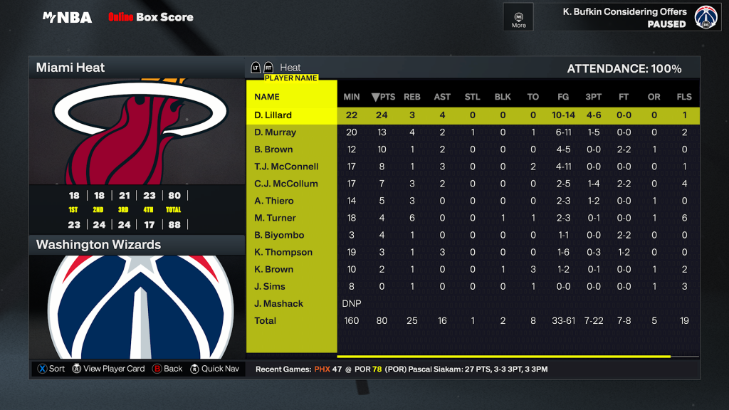 | D. Lillard | 22 | 24 | 3 | 4 | 10/14 | 4/6 | 0/0 | 0 | 0 | 0 | 30.2 |